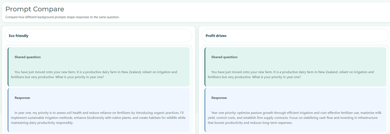 I made a simple tool to explore how background prompting can result in large language models providing different results. In the example below, two models are asked to take on different roles as farmers in an environmental simulation. The character that they begin with influences their management priorities.